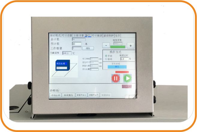 人機交互界面,中文文字與圖像相結(jié)合顯示10吋觸控主控彩屏,銑背深度、底膠和側(cè)膠量大小、壓痕位置和深度、斷膠位置、方圓脊等均可方便設定調(diào)整,具備操作記錄、數(shù)據(jù)存儲、工效統(tǒng)計等功能。